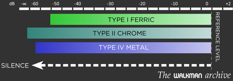 As a rule of thumb, type I tapes are the noisiest, with levels that are around -50 dB. Type II (chrome) are much quieter* and go down to -59dB (which is up to 1.5 times quieter than type I). Type III (FeCr) was a commercially failed experiment, but they have a noise of about …-60dB. The noise level on Type IV (metal) is around -56dB (which is half noisier than type I).