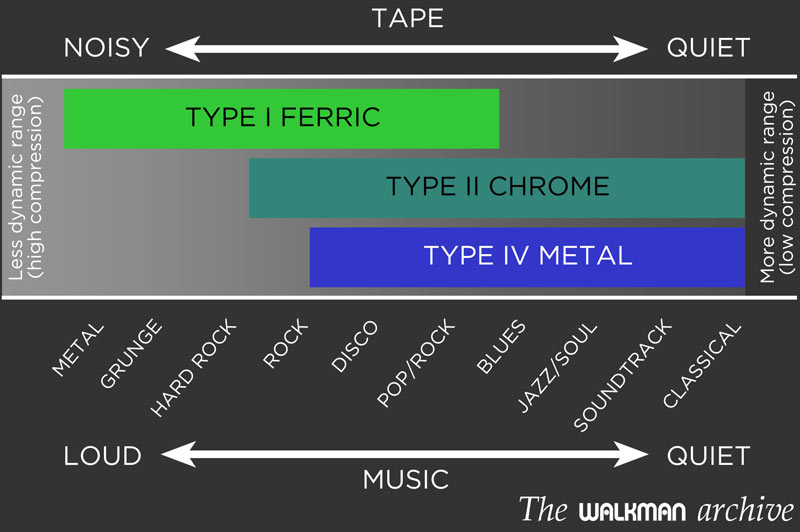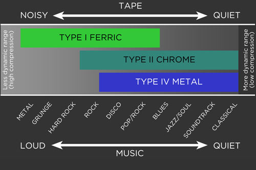 Given those conclusions, I can summarize them in this graph when you can see the ideal use for the three tape types depending on the music to be recorded: