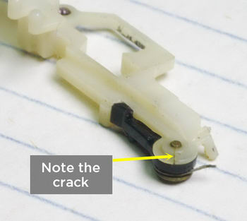 It is very probable that this one is cracked. Sometimes it can result in the plastic reel coming off. The fix is very simple, glue it to the axle.
